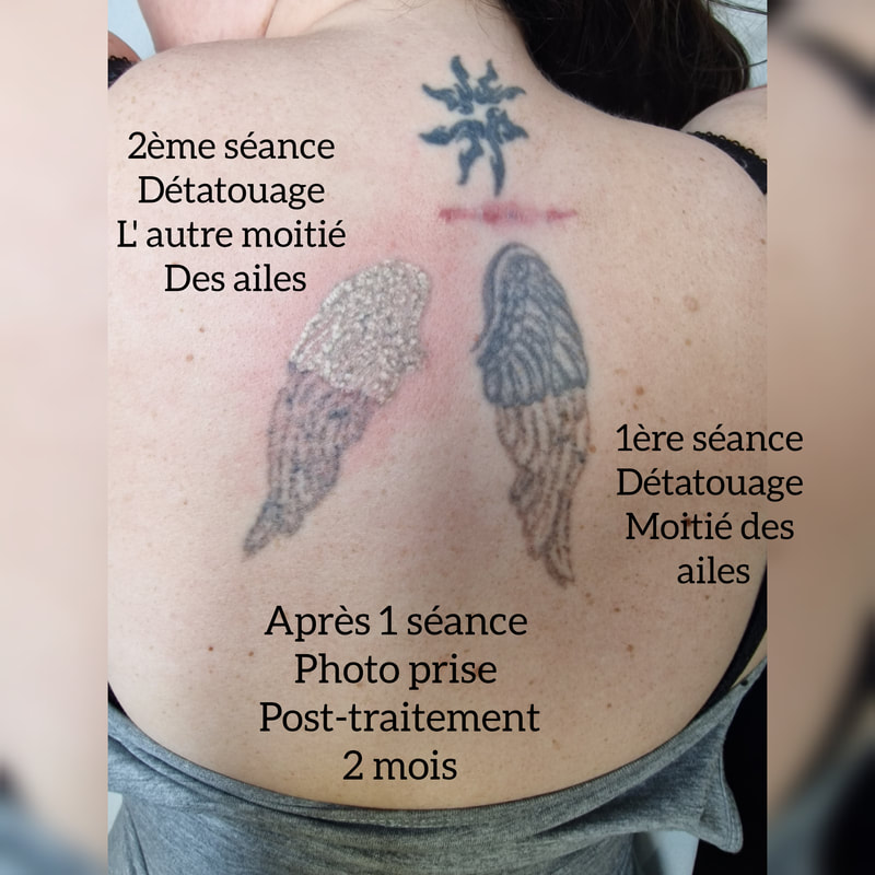 Il est impossible de prévoir le nombre exact de séances nécessaires, car chaque tatouage et corps sont uniques, entraînant des résultats variables d’une personne à l’autre. En général, on peut s’attendre à ce que 1 à 4 séances pour un maquillage permanent et 6 à 10 séances pour un tatouage artistique soient nécessaires pour obtenir de bons résultats. Les séances seront espacées de 8 semaines minimum afin de laisser le temps à la peau de cicatriser en profondeur et se régénérer. Sa ne sert strictement à rien de rapprocher les séances et ceci réduit les chances d’avoir une peau sans hyper/hypo pigmentation. Le fait d’espacer les séances n’est absolument pas du temps perdu au contraire, le système lymphatique continu de travailler et d’éliminer le pigment même après 2 mois. La durée d’une séance varie selon la taille et la zone  du tatouage à enlever.