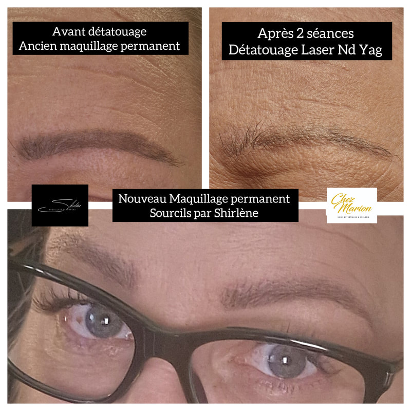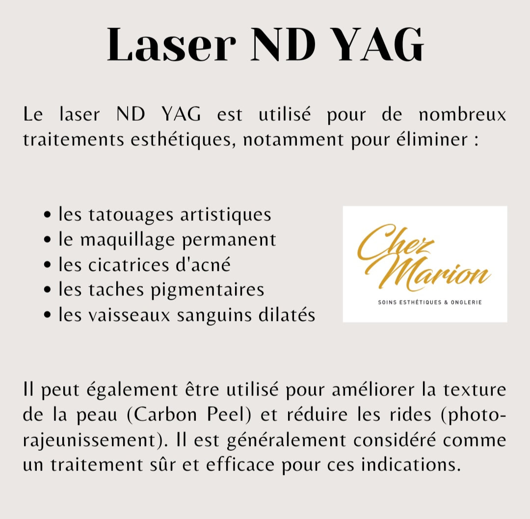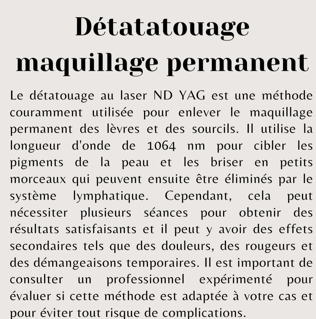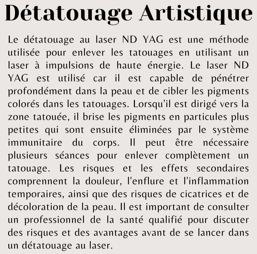 Le détatouage au laser ND YAG est une méthode utilisée pour enlever les tatouages en utilisant une source de lumière intense pulsée (IPL) pour cibler les pigments du tatouage. Le laser ND YAG est un laser à haute énergie qui est capable de pénétrer profondément dans la peau pour cibler les pigments. Lorsque les pigments sont exposés à la lumière laser, ils sont brisés en petits morceaux qui sont ensuite éliminés progressivement par le système lymphatique dans les semaines et mois suivants. Le laser ND YAG permet de détatouer les différentes couleurs d’un tatouage (tatouages artistiques et maquillage permanent) car il a plusieurs longueurs d’onde. Ce processus peut prendre plusieurs séances pour enlever complètement un tatouage, et il peut y avoir des effets secondaires temporaires tels que des rougeurs, des douleurs et des cicatrices.