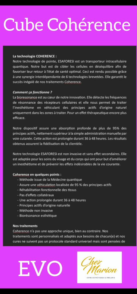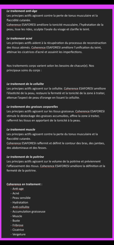 Une solution novatrice par bio-résonance. Cette appareil de dernière technologie avec 5 brevets internationaux permet d’appliquer et de véhiculer les divers principes actifs de très haute qualité exactement là ou l’on veut dans la cellule. Grâce aux ultrasons à basse fréquence combinés à des impulsions de résonance spécifiques, cela permet une absorption d’une extrême efficacité de l’ordre de 95%, ce qui permet de garantir une action déjà visible à la première séance. Testé en institut depuis plusieurs mois, les résultats sont stupéfiants.